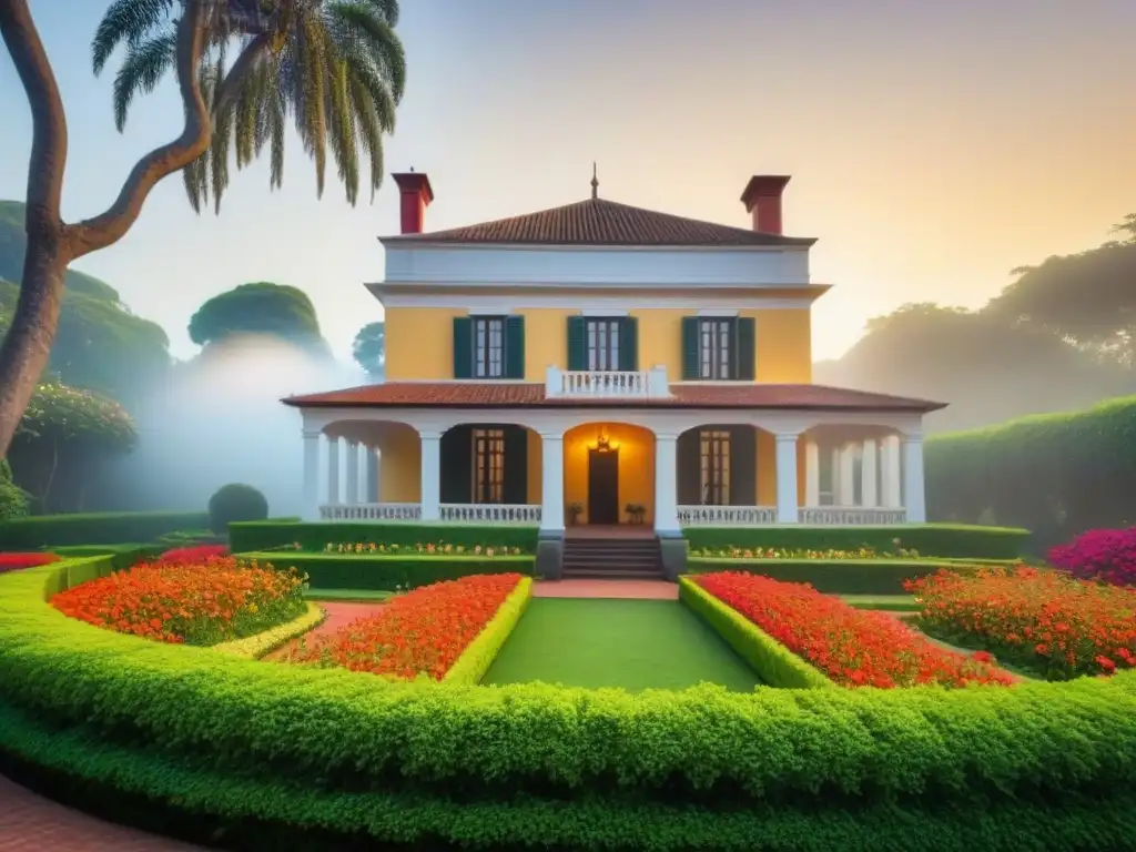 Imponente edificio histórico restaurado rodeado de jardines verdes y muebles modernos