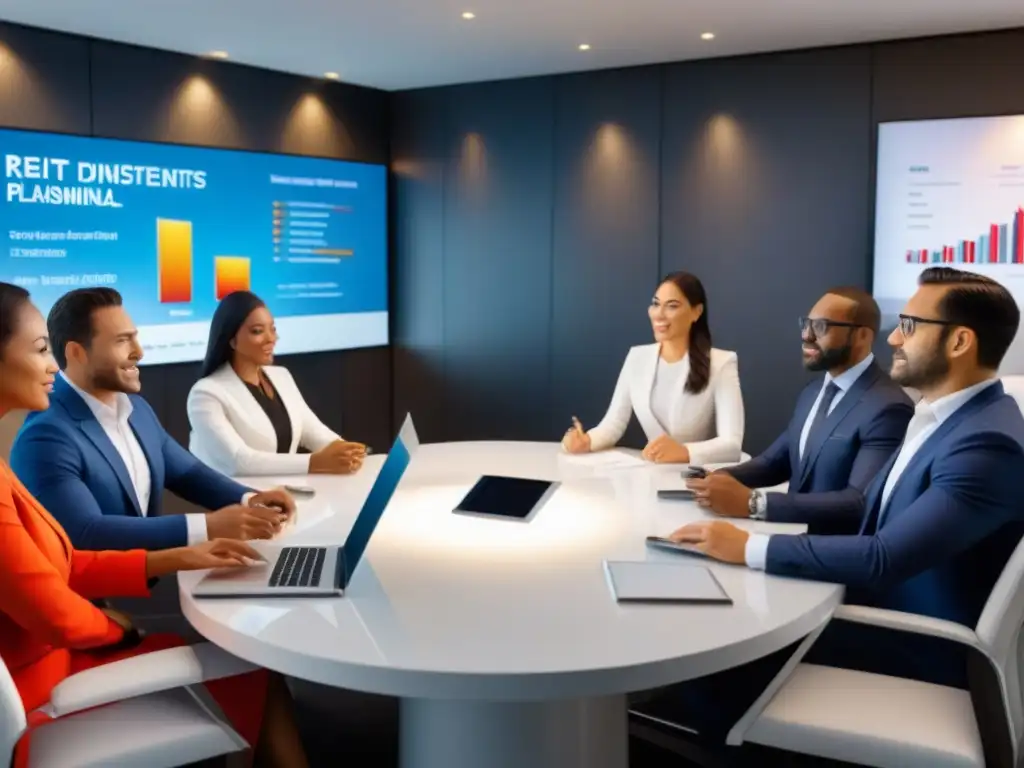 Inversores profesionales diversificados debaten sobre REITs en una sala moderna