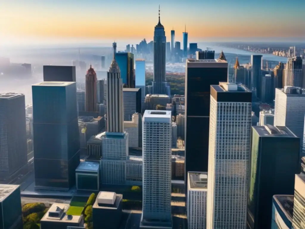Un horizonte urbano futurista al atardecer con rascacielos modernos y arquitectura vanguardista